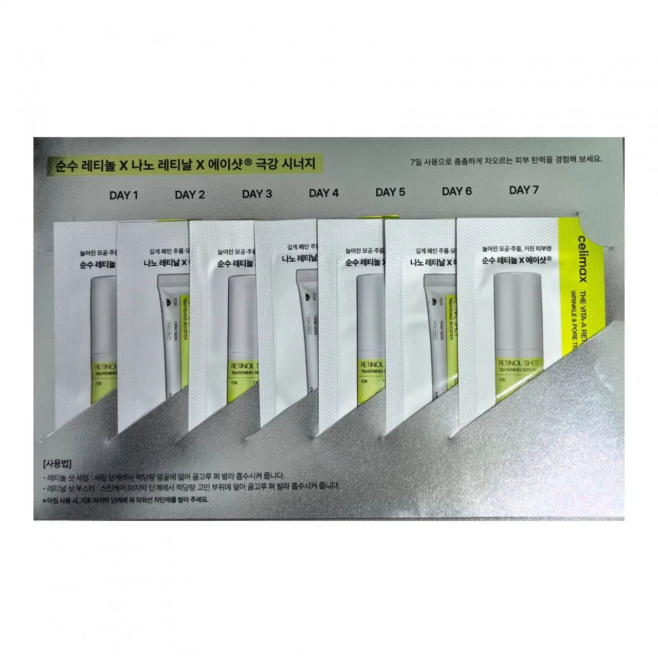 - (дни 1, 3, 5, 7) celimax VITA-A Сыворотка с ретинолом и микроиглами, подтягивающая | The VITA-A Retinol Shot Tightening Serum. Во время вечернего ухода нанесите необходимое количество сыворотки на предварительно очищенную кожу, распределите пальцам и дождитесь полного впитывания. Продолжите уход кремом.
