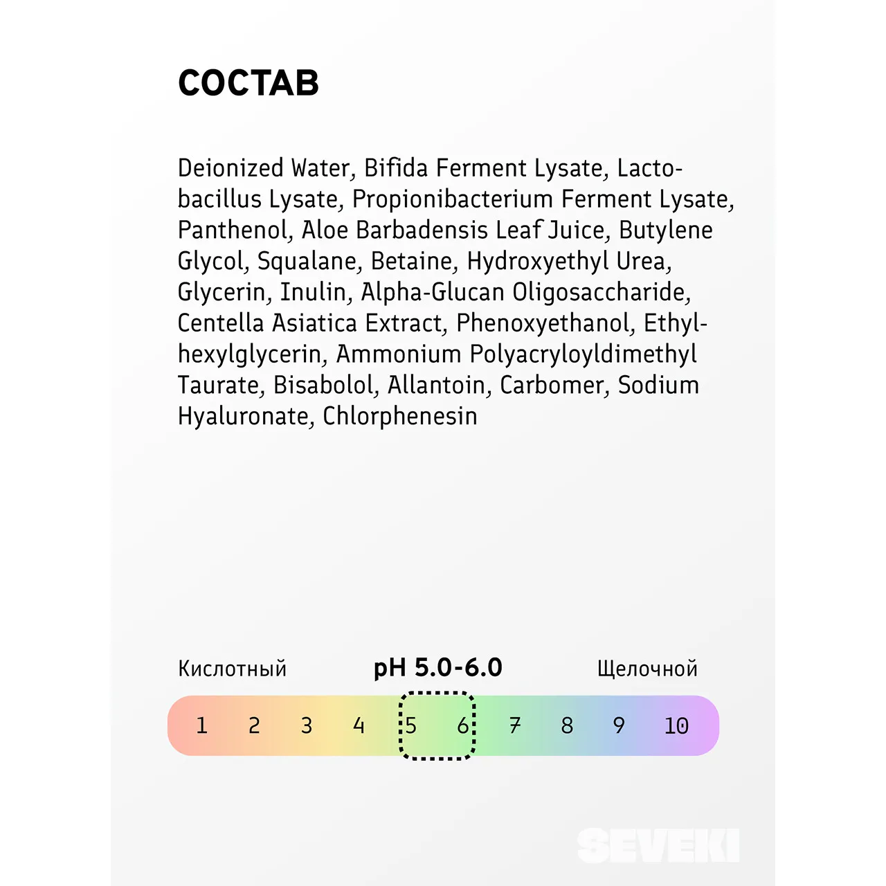 | Состав: | Deionized Water, Bifida Ferment Lysate, Lactobacillus Lysate, Propionibacterium Ferment Lysate, Panthenol, Aloe Barbadensis Leaf Juice, Butylene Glycol, Squalane, Betaine, Hydroxyethyl Urea, Glycerin, Inulin, Alpha-Glucan Oligosaccharide, Centella Asiatica Extract, Phenoxyethanol, Ethylhexylglycerin, Ammonium Polyacryloyldimethyl Taurate, Bisabolol, Allantoin, Carbomer, Sodium Hyaluronate, Chlorphenesin. |