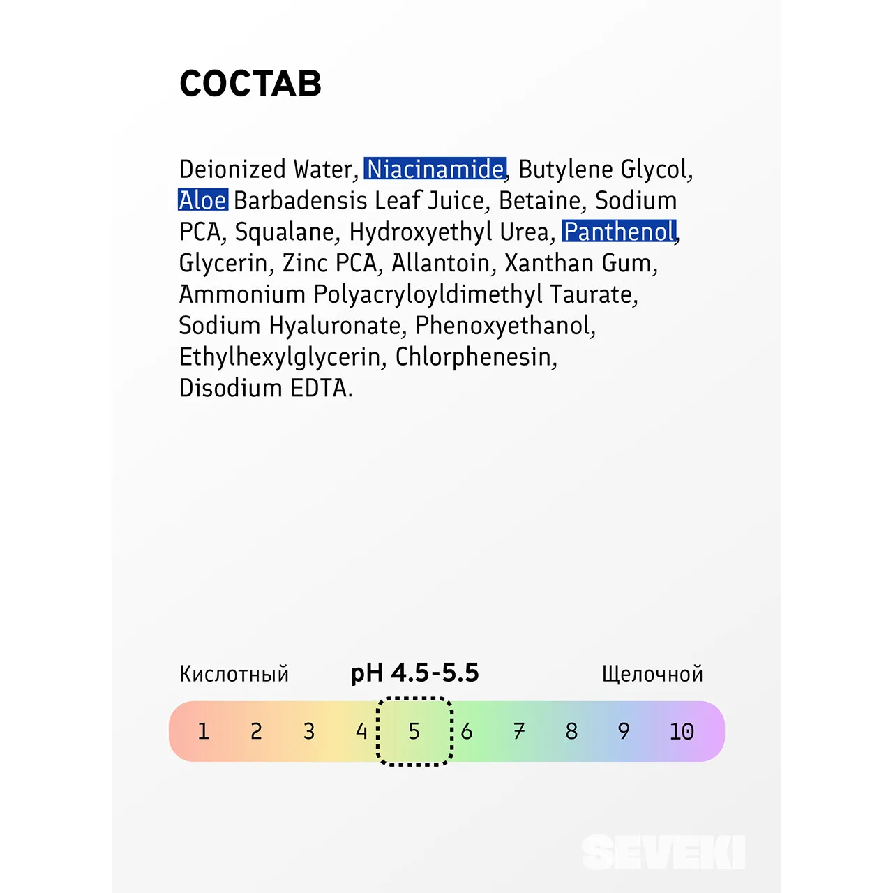 | Состав: | Deionized Water, Niacinamide, Butylene Glycol, Aloe Barbadensis Leaf Juice, Betaine, Sodium PCA, Squalane, Hydroxyethyl Urea, Panthenol, Glycerin, Zinc PCA, Allantoin, Xanthan Gum, Ammonium Polyacryloyldimethyl Taurate, Sodium Hyaluronate, Phenoxyethanol, Ethylhexylglycerin, Chlorphenesin, Disodium EDTA. |