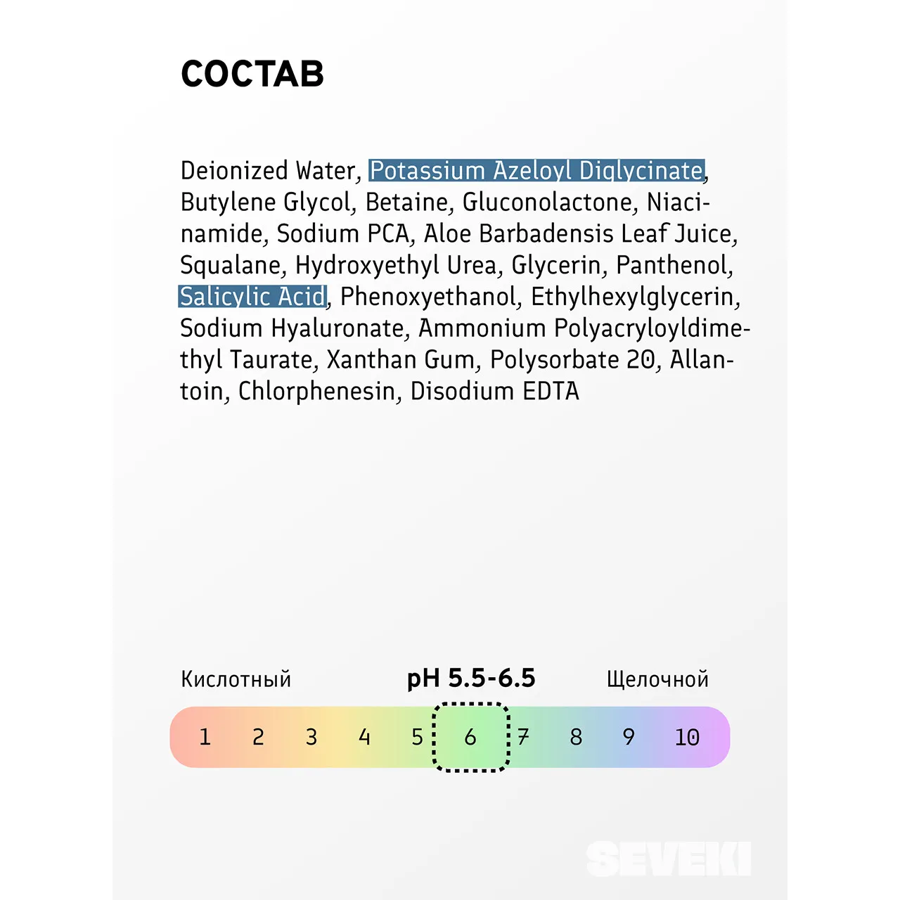 | Состав: | Deionized Water, Potassium Azeloyl Diglycinate, Butylene Glycol, Betaine, Gluconolactone, Niacinamide, Sodium PCA, Aloe Barbadensis Leaf Juice, Squalane, Hydroxyethyl Urea, Glycerin, Panthenol, Salicylic Acid, Phenoxyethanol, Ethylhexylglycerin, Sodium Hyaluronate, Ammonium Polyacryloyldimethyl Taurate, Xanthan Gum, Polysorbate 20, Allantoin, Chlorphenesin, Disodium EDTA. |